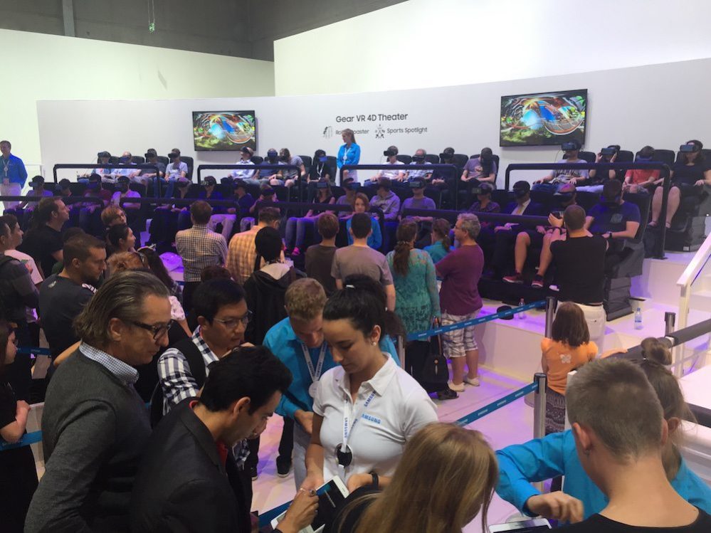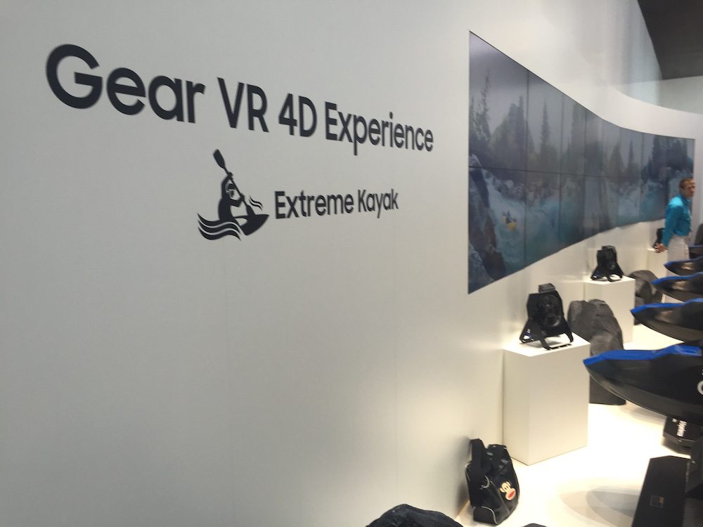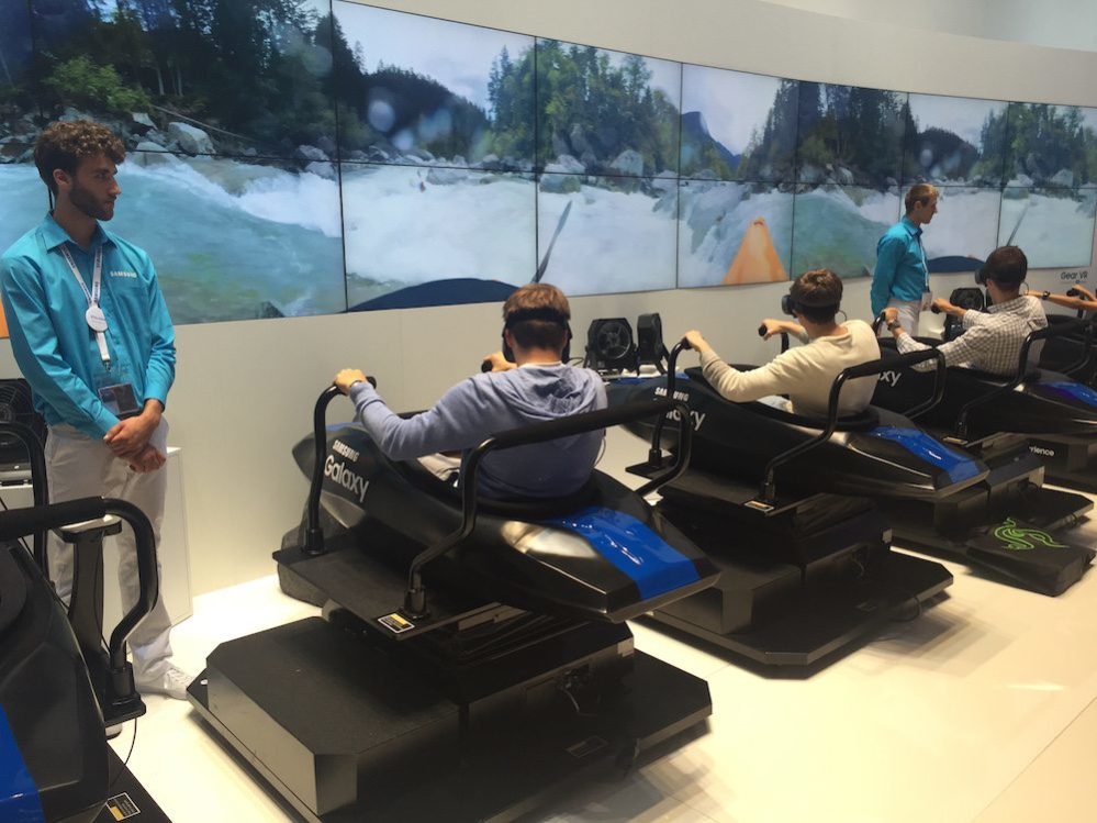 Eine weitere Virtual-Reality Station von Samsung beinhaltete eine Reihe von Kajaks, die zum Platz nehmen einluden und dem Nutzer eine Wildwasserfahrt im Trockenen ermöglichten, inclusive Paddel und virtuellem Weißwasserspaß. Der Andrang der virtuellen Kanuten war beindruckend, ebenso wie das lautmalerisch intonierte, deutlich wahrnehmbare Vergnügen der Probanden. Interessant bei diesem Case ist die zunehmende Verzahnung von auf 360-Grad-Video abgestimmte Sensorik, die durch koherente, zum Ablauf des 360-Grad-Videos passende Bewegungssimulation den Effekt der Immersion, des Abtauchens in das virtuelle Erleben, entsprechend verstärkt.
